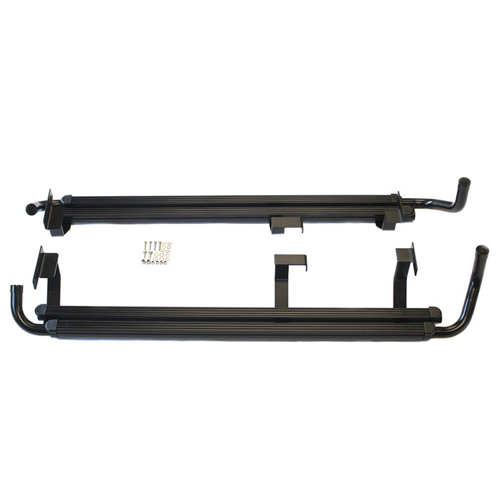Defender Tubular Side Runners, sold as a pair, made with black powder-coated tubular construction and plastic tread surfaces. Supplied with hardware and instructions. OEM. Made in the UK.