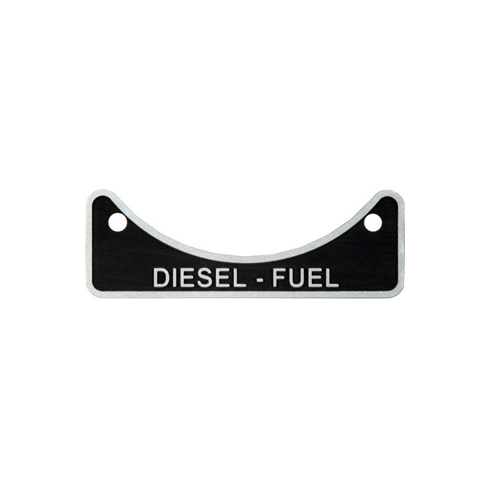 Black alloy diesel fuel label. Silver text. Fixes to the fuel filler assembly on diesel model Land Rovers
