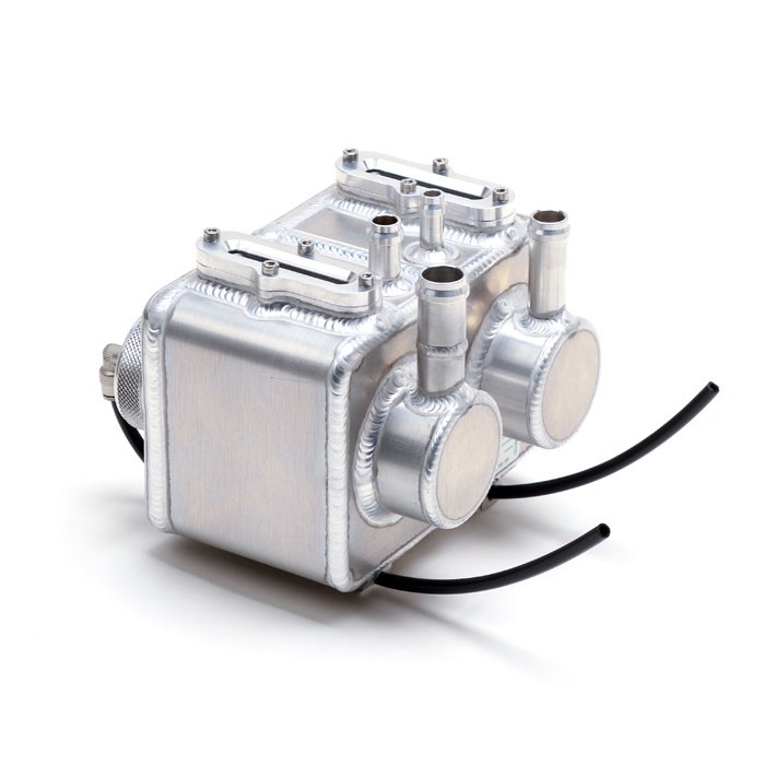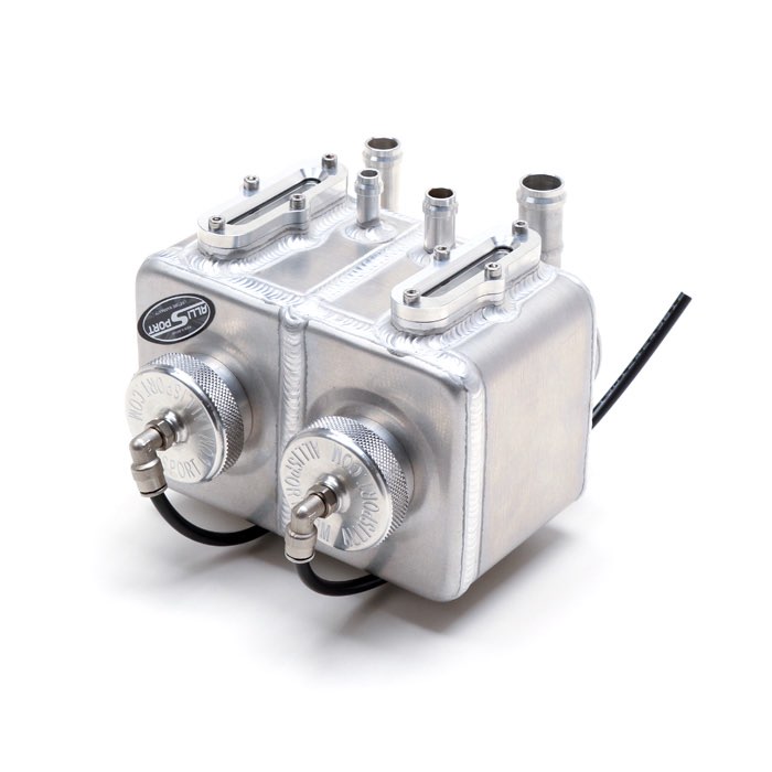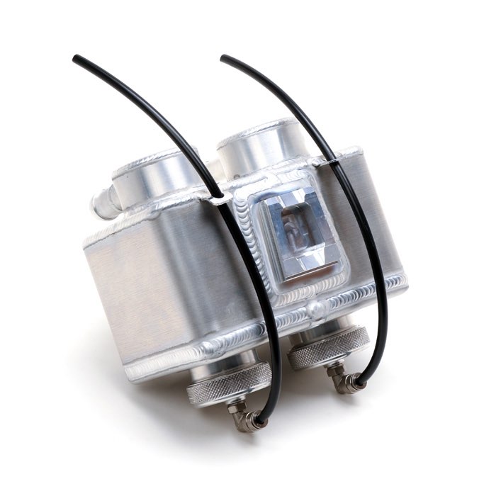 Direct replacement aluminum power steering reservoir for Discovery II with active cornering enhancement (ACE). Includes level sight gauges and external breathers to prevent water ingress.