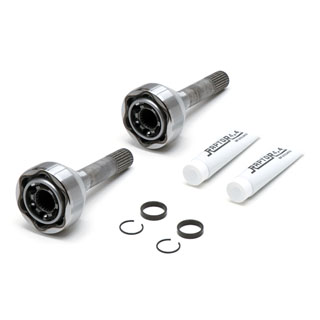 Heavy-duty 24-spline CV joint and front axle shaft replacement kit for non-ABS Defender, Discovery I, and Range Rover Classic from 1994 on. Kit includes a pair of heavy-duty CV joints with circlips and swivel grease packs, and heavy-duty LH and RH half shafts with spacer.