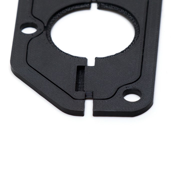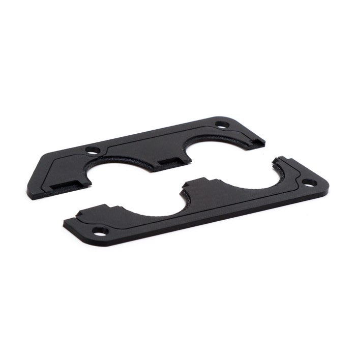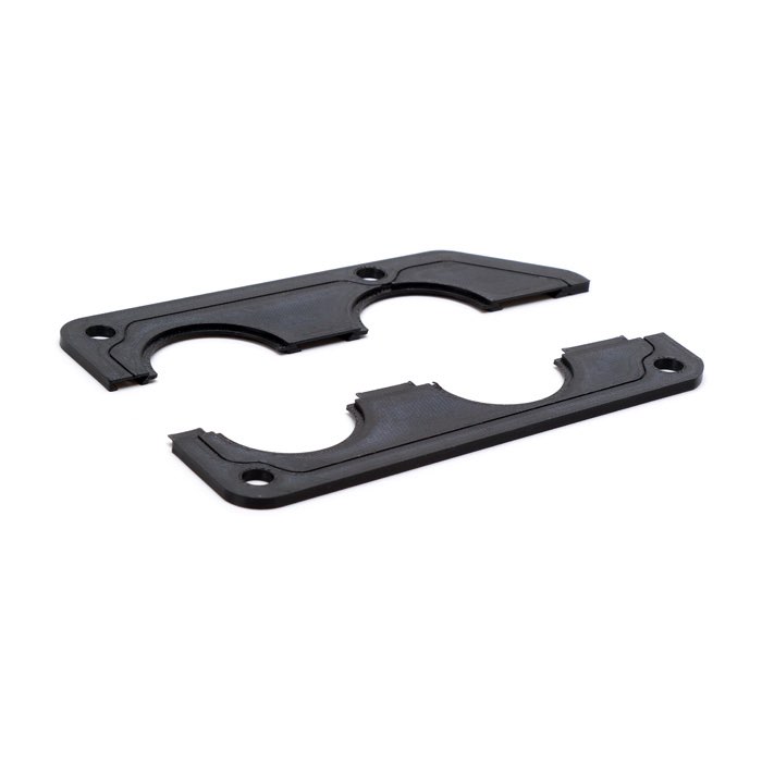 2 hole split interlocking plastic grommet plate. Replacing a worn or damaged grommet plate is historically impossible without disconnecting wiring and pulling it through. We thought it would be handy if the plate came apart so you didn't have to do that, allowing for in place repairs. This grommet plate is split and dovetailed so it can be taken apart and put back together allowing for much more flexible repairs.