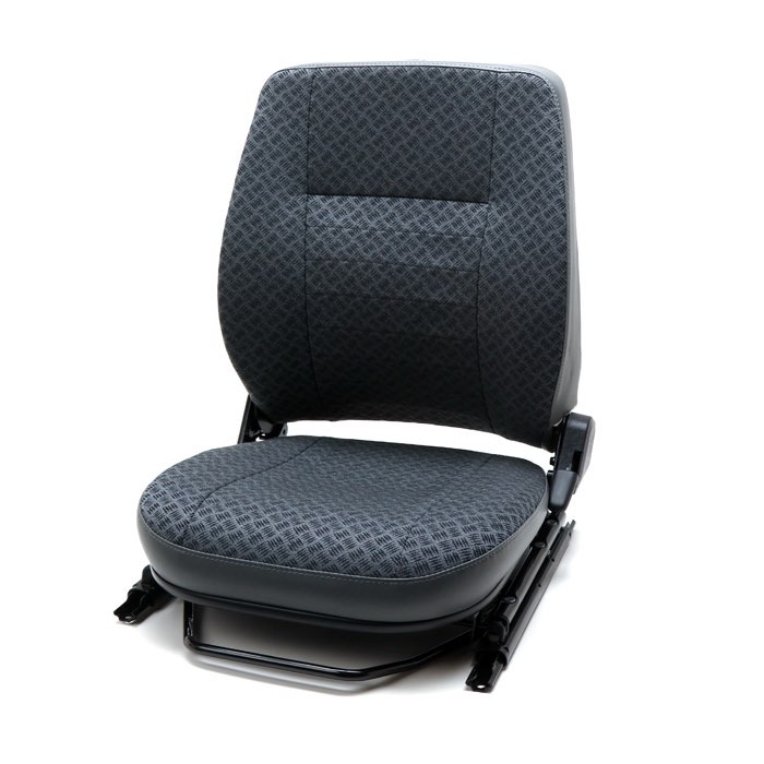 Defender left front seat in Techno cloth and grey vinyl with a back map pocket. Includes subframe, seat mechanism cover, and recline lever knob. Made in the United Kingdom.