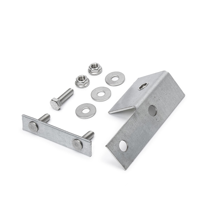 Front right wing to bulkhead bracket for early Defender. Bracket comes with stud plate and hardware. Made from galvanized steel plates with stainless hardware.