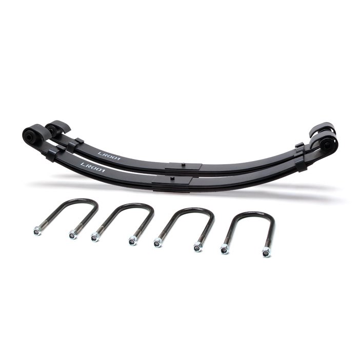 One pair of front 2-leaf parabolic springs with u-bolts and nuts. Provides a major improvement in ride quality and improved off-road capability by providing better ground contact due to the increased suspension flexibility. Made in The U.K.