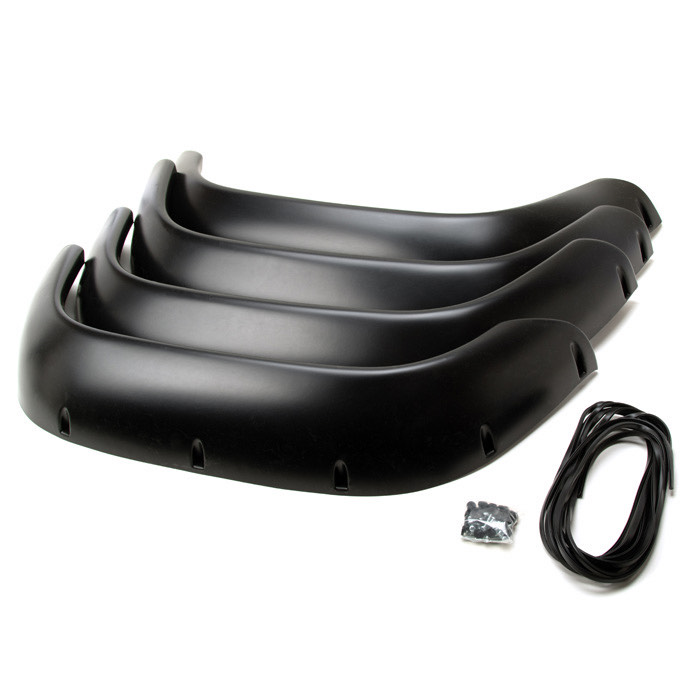 Flexi wheel flare set. Plastic moulded pieces. Bolts to fenders, requires modifications and cutting existing body work to fit. Includes hardware and instructions. Set of four.