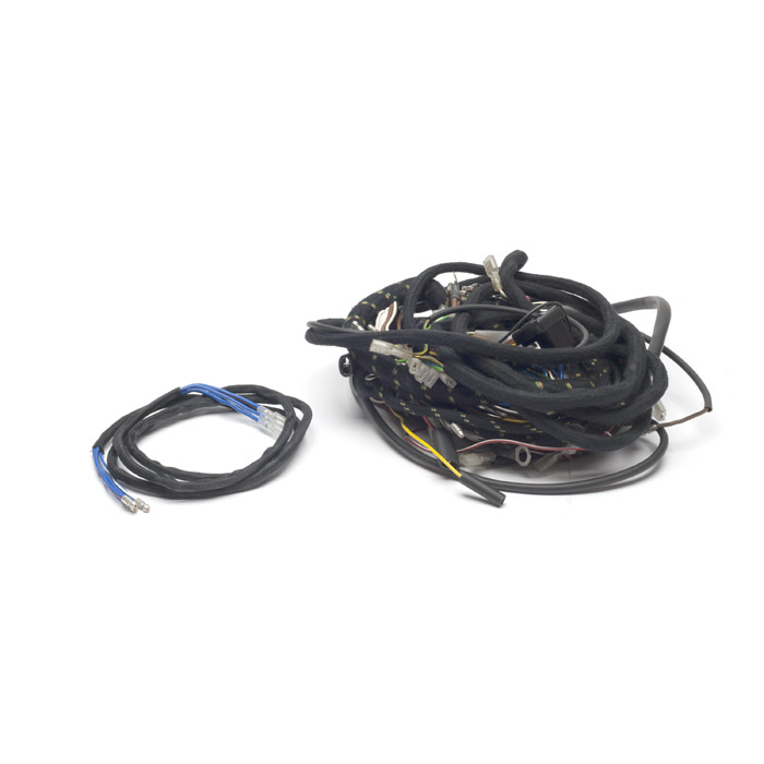 Electrical. Period correct, braided outer cloth covering. Main wiring harness assembly for early Series 2a models that have been converted to use a Lucas-style alternator. This harness fits vehicles that left the factory with two independent wiper motors mounted on the windscreen frame and an ammeter in the instrument cluster. This harness is designed to bypass the external voltage regulator mounted located on the engine side of the bulkhead next to the fuse box.