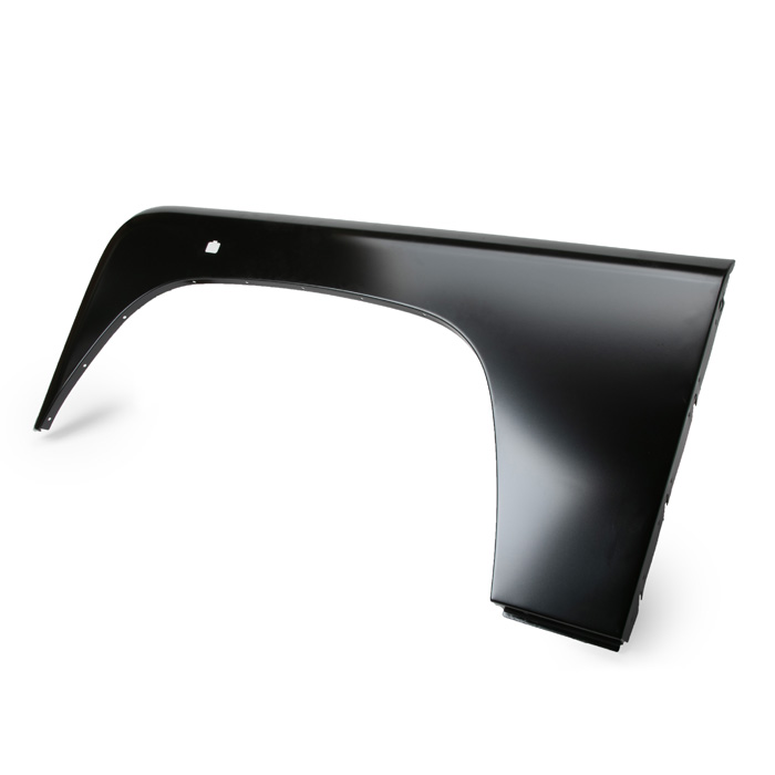 Wing panel, left side, outer, front fender. Pre-cut for lamp. Finished in electrostatic E-Coat black primer. Ready for paint.
