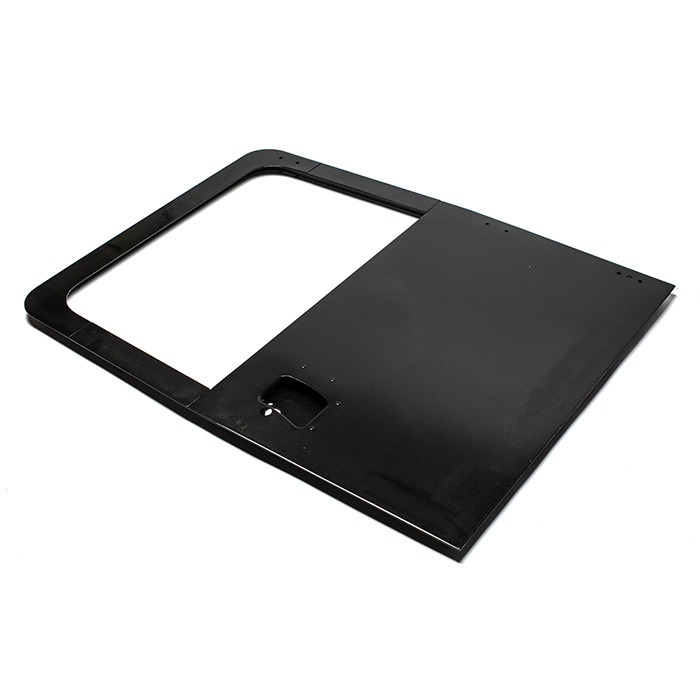 Land Rover Genuine Part. Rear 3 hinge door shell assembly without provision for a spare wheel mount. Features solid alloy skin over steel frame with retainer bracket for late style torsion bar mechanism to retain the door in the open position. Can accommodate rear tire carrier and rear wiper motor, but requires drilling the alloy skin. Black electrostatic primer finish, glass not included. Made in Great Britain.