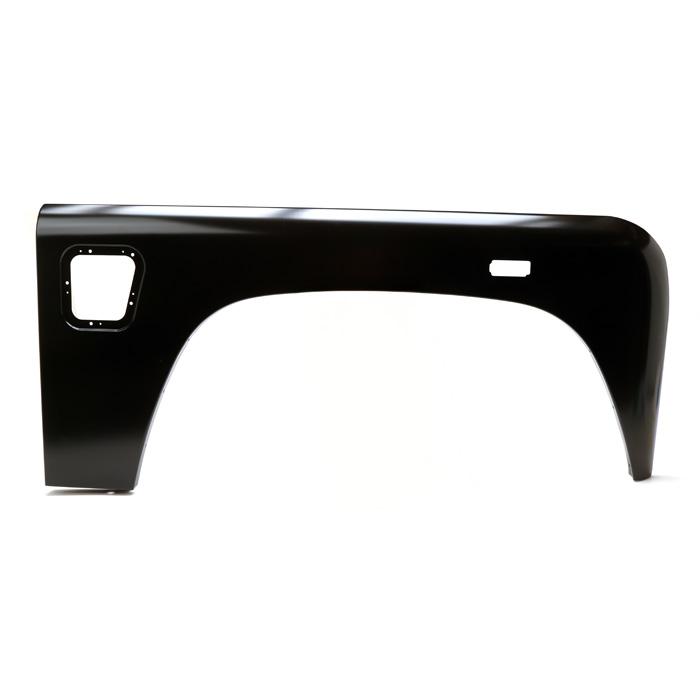 Wing panel, right side, outer, front fender. Pre-cut for intake cover and lamp. Finished in electrostatic E-Coat black primer. Ready for paint.