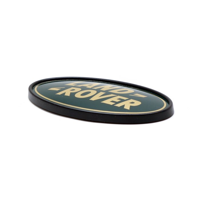 Stick on adhesive Land Rover badge, 3.5 inch 3D oval, gold & green enamel look. Land Rover Genuine Part.