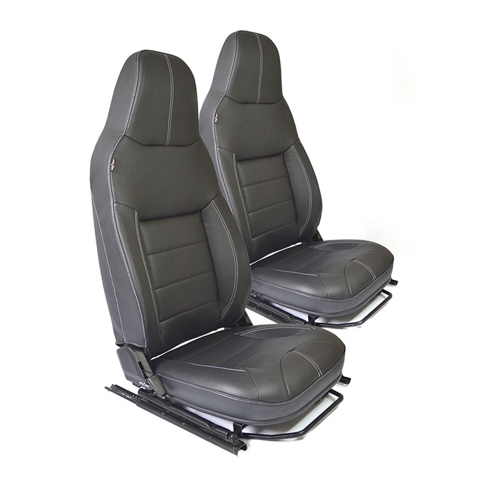 Premium vinyl front seat set in the latest factory special edition style for Defender. Right and Left hand front Defender adjustable seat assemblies in Black grained vinyl with white accent stitching. Larger, more comfortable with better support. Complete assembly includes integral head rest, adjustable seat frame, removable bottom cushion, adjustable seat back with rear pocket. Equipped with bottom and back heater elements. Seat assembly includes heater harness with hi / low switch. Made in the UK by Exmoor Trim.