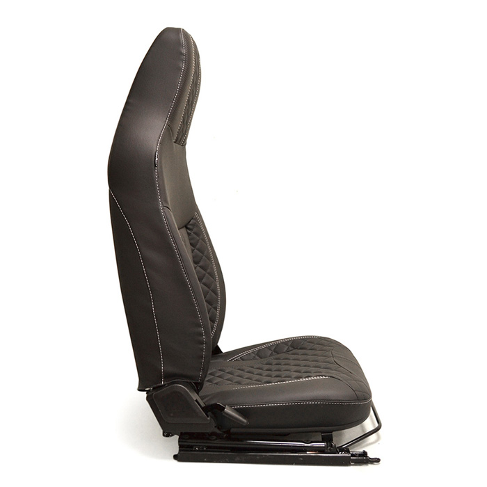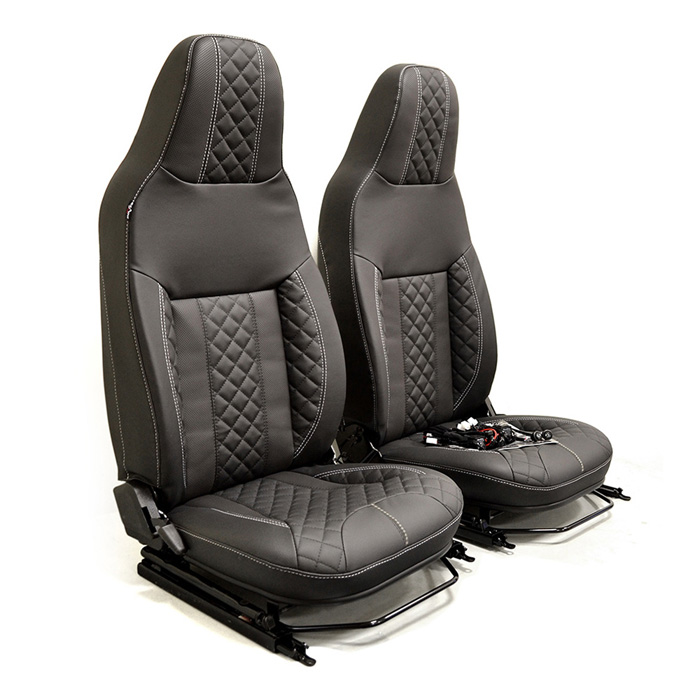 Premium quilted leather front seat set for Defender. Right and Left hand front Defender adjustable seat assemblies in Charcoal leather with Diamond XS facing. Larger, more comfortable with better support. Complete assembly includes integral head rest, adjustable seat frame, removable bottom cushion, adjustable seat back with rear pocket. Equipped with bottom and back heater elements. Seat assembly includes heater harness with hi / low switch. Made in the UK by Exmoor Trim.