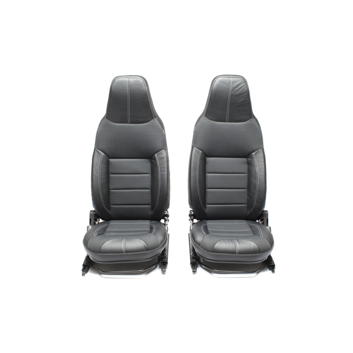 Right and Left hand front Defender adjustable seat assemblies in the latest XS Black Rack material. Black leather sides and back with Black cloth facing. Larger and more comfortable. Complete assembly includes integral head rest, adjustable seat frame, removable bottom cushion, adjustable seat back with rear pocket. Equipped with bottom and back heater elements. Seat assembly includes heater harness with hi / low switch. Made in the UK by Exmoor Trim.