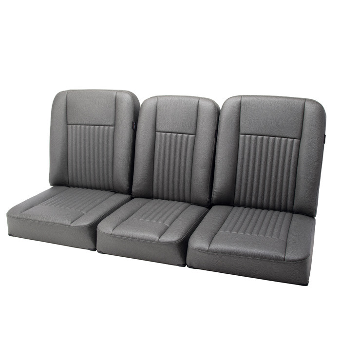 This style of seat was used throughout the production run of the Series III Land Rover with its distinctive, sculptured seats and face fluting running from front to back in the center panels of the seats. The outer seat backs bolt in and also have internal threads for the locking positions. The center seat back mounts with the pin type fitting. The outer bases and center bases sit into the seat frames and are removable to allow access to the seat box compartments.