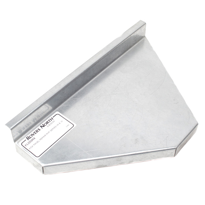 Left hand kick panel. Triangular panel located on the inside of the door post. Has flanged corner to interconnect with replacement toe board to reconstruct a rusted through floor area. Galvanized.