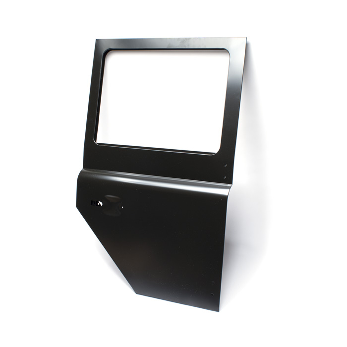 Defender 110 and 130 RIGHT Middle Door Shell, 2005 on. This is the latest and safest reinforced door produced by Land Rover. Manufactured with galvanized skin over galvanized frame to prevent corrosion from dissimilar metals. Includes internal crash beam for improved side impact safety. Finished in black electrostatic E-Coat primer for superior corrosion protection.