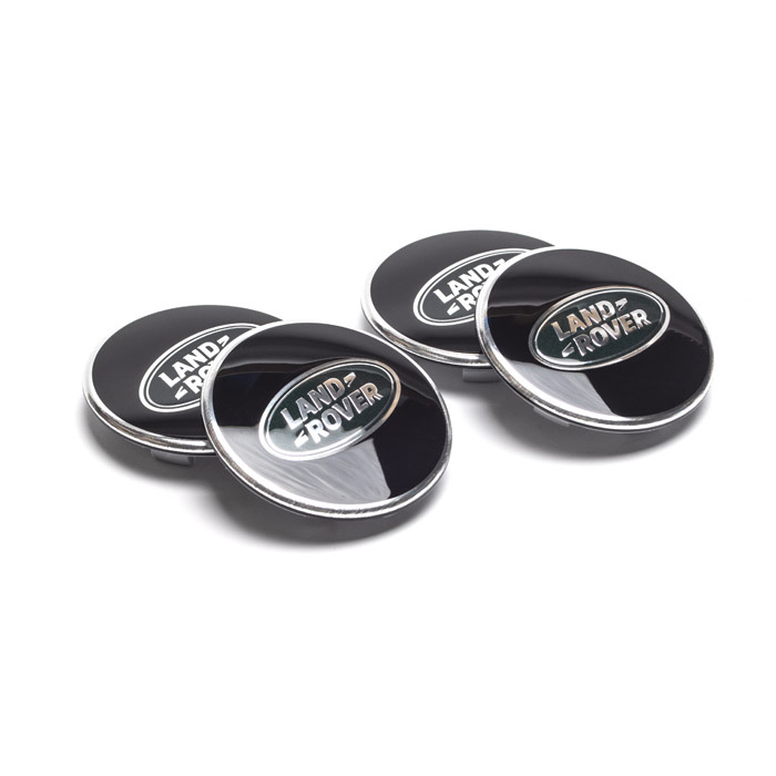 Set of 4 wheel center caps in bright black with Land Rover logo. For alloy wheels. 61.5mm diameter