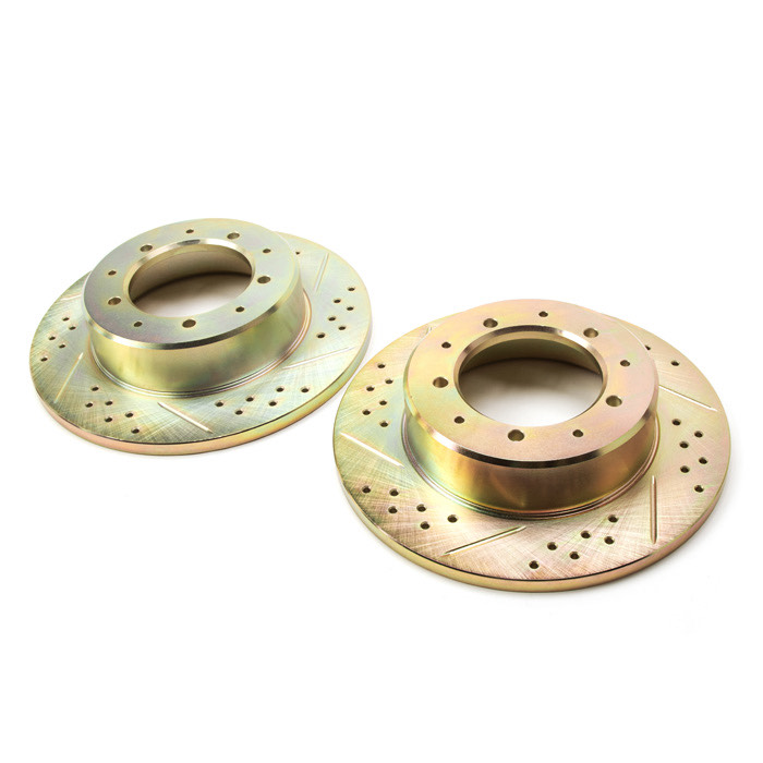 One set of two rear slotted (for gas venting) and cross-drilled (for cooling) performance brake rotors.