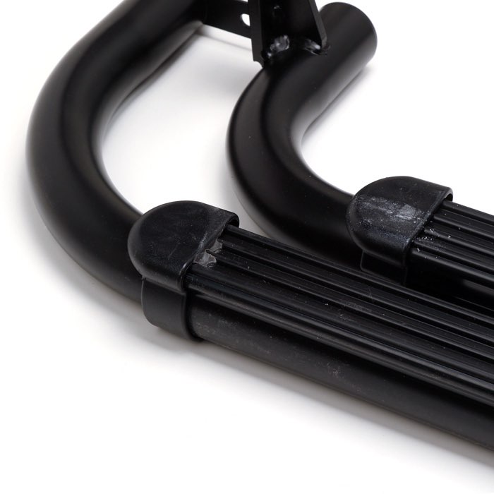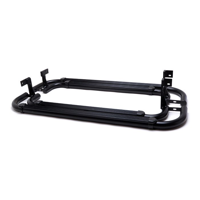 Defender Twin Tubular Side Runners, sold as a pair, made with black powder-coated tubular construction and plastic tread surfaces. Supplied with hardware and instructions. OEM.
