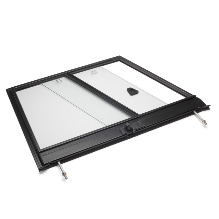 Corrosion proof, all alloy door top assembly with sliding front and rear glass as fitted to Military and NAS 90 soft tops. Includes interior window lock and mounting studs. Supplied in E Coat Satin black. High quality OEM Part. Made in the UK.