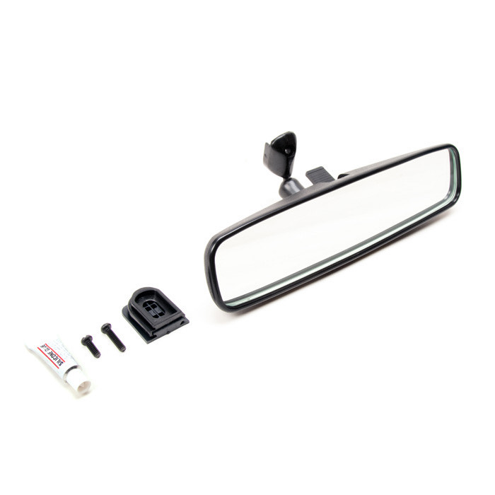 Windscreen mount rear view mirror with manual dipping switch. Includes mounting hardware and silicone glue.