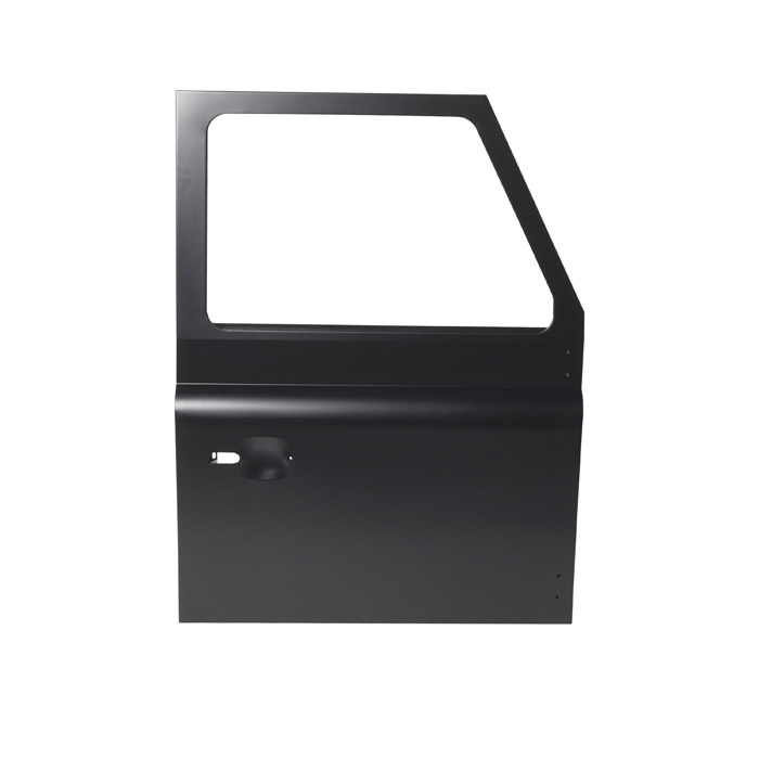One piece Defender right front door. High quality OEM replacement for early Defenders from 1987 to 2001. Steel frame with aluminum skin. Electrostatically E-Coat primed in matte black, ready for paint. Made in the UK.