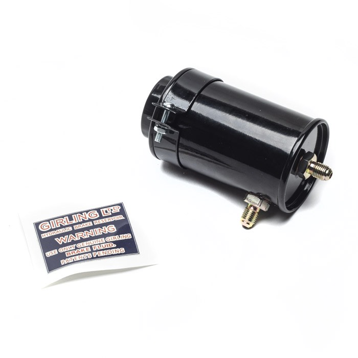 Dual clutch & brake reservoir assembly. Partitioned interior provides separate reservoirs with a common fluid reserve on top. Includes adjustable mounting bracket, vented metal cap and Girling brake fluid label RNA1257. Durable epoxy black finish. High quality OEM.
