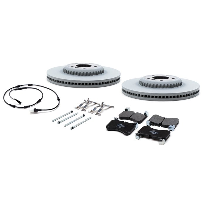 This kit includes front axle brake pads, discs, a brake pad wear warning harness, and hardware for models with 363mm discs.