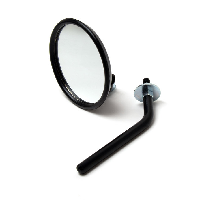 Round wing (fender) mount mirror assembly for Series II, IIa, and III. Convex for wider view angle and better visibility.