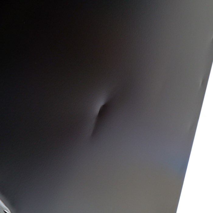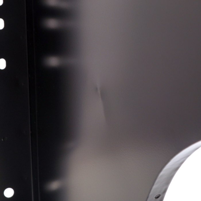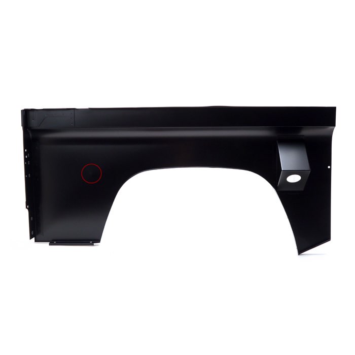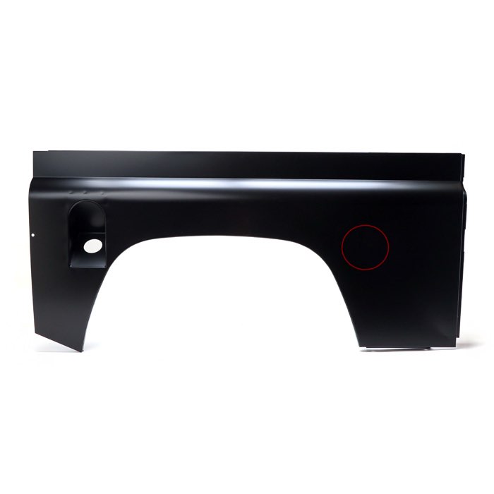 Aluminum right hand rear side panel with fuel filler for Defender 90 models with a rear mounted plastic fuel tank. Black powder coated finish.