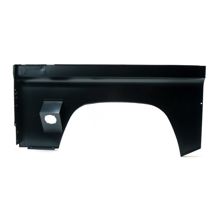 Aluminum right hand rear side panel with fuel filler for Defender 90 models with a side mounted fuel tank. Black powder coated finish.