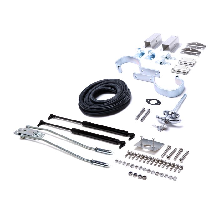 Complete replacement catflap kit for Series II-III, can also be fitted to Defender hard tops. Kit includes door with alloy skin and galvanized steel frame, glass, seal, brackets, hardware, and a gas strut kit which improves upon the original prop rod.