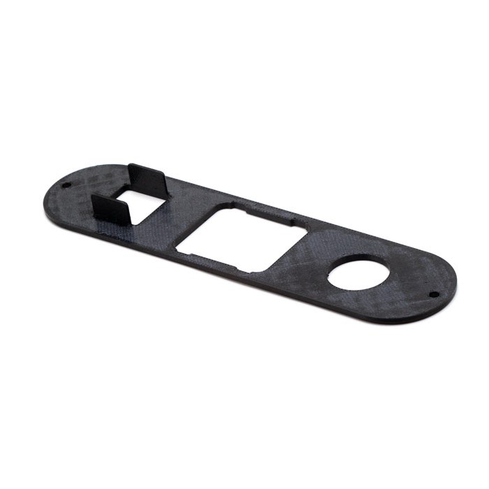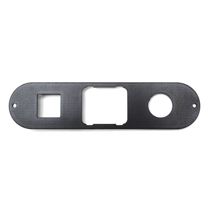 Facia plate for center lower dash with hazard switch, square clock, and cigar lighter configuration as used on Defender NAS 90. Please note that this facia plate is manufactured of carbon fiber reinforced ABS plastic, not vinyl-covered metal as the original. It can be covered in vinyl to match the original look or left uncovered for a carbon fiber appearance.