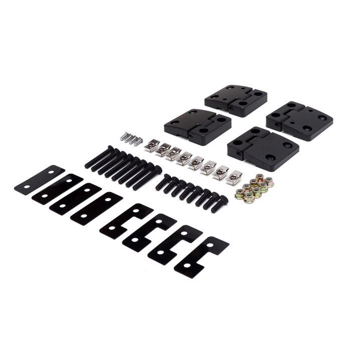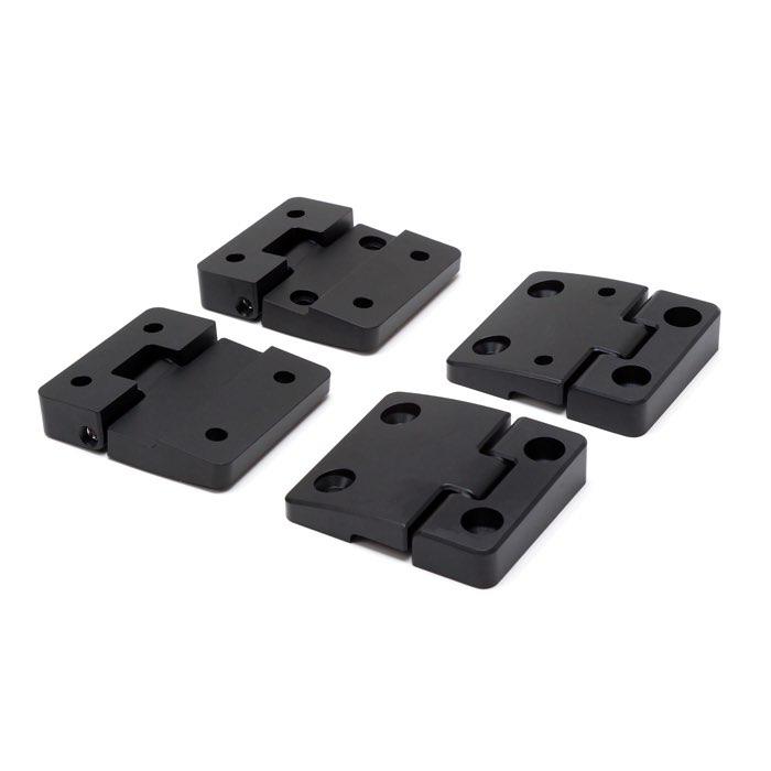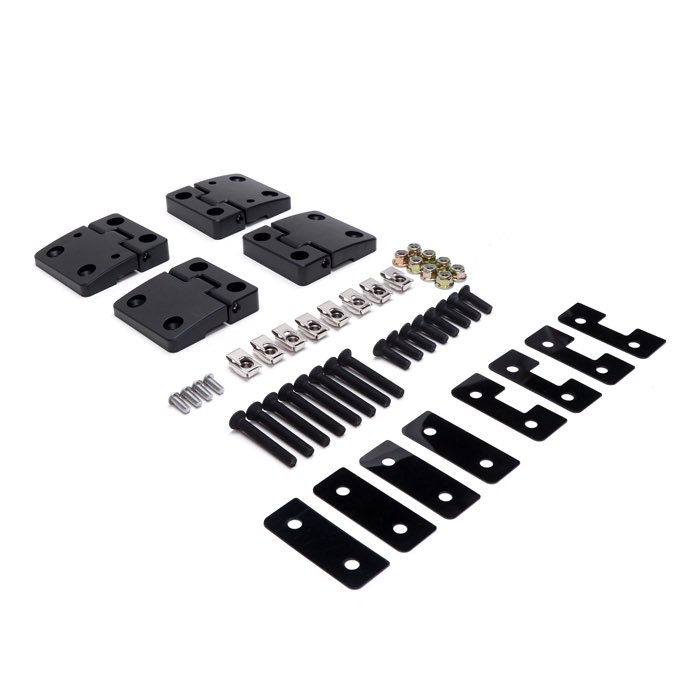 Upgrade your Defender or Series front doors with this premium aluminum hinge kit. Precision CNC machined from billet aluminum and black anodized for maximum durability and corrosion resistance. Featuring 5/16" stainless steel pivot pins and self-lubricating acetal Delrin bushings, these hinges require no maintenance and ensure long-lasting, smooth, friction-free movement. Includes hinges, shims, and mounting hardware for both front doors.