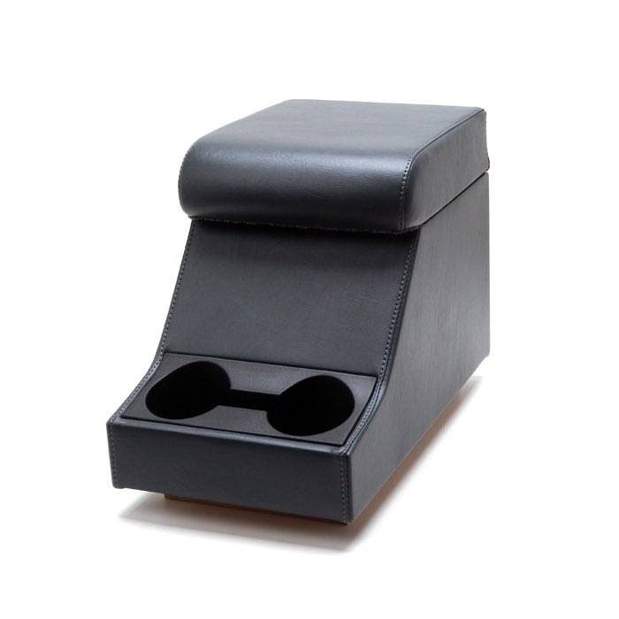 This grey vinyl "chubby" box features four times the lid padding of a standard ProLine cubby box. The 80mm (3.15") thick padding provides a comfortable armrest to make driving more of a pleasure while the cubby box helps keep your Land Rover free from clutter. Includes a double cup holder. Handmade in the UK.
