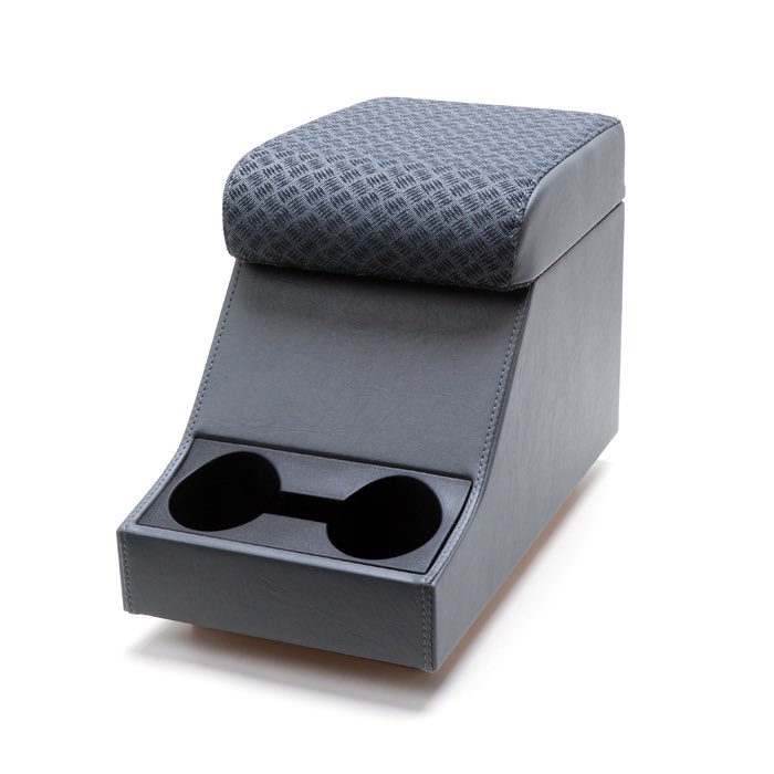 This grey vinyl "chubby" box with a Techno cloth lid features four times the lid padding of a standard ProLine cubby box. The 80mm (3.15") thick padding provides a comfortable armrest to make driving more of a pleasure while the cubby box helps keep your Land Rover free from clutter. Includes a double cup holder. Handmade in the UK.