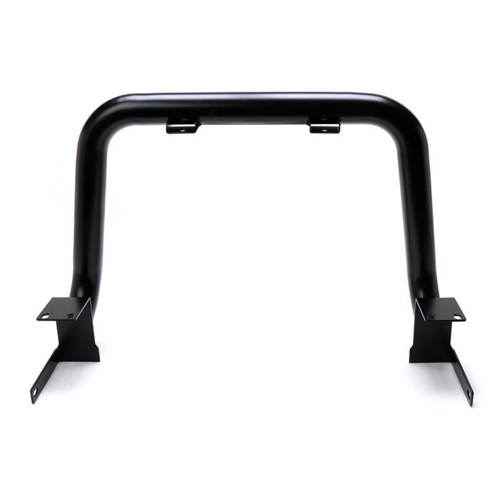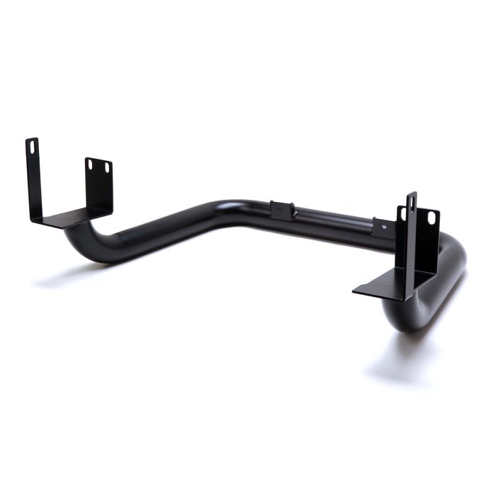 A-bar designed to accommodate stick-out plastic front radiator panel on Defenders with air conditioning. Mounts using existing front bumper mounting holes with additional mounting points on the side of each chassis rail. Black powder-coated steel. Does not include mounting hardware.