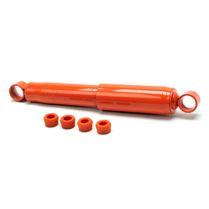 Extended length front shock for use with parabolic spring equipped Series II, IIa, and III. Features a foam insert rather than pressurized gas, which takes up less space. This allows for 50% more oil, increasing heat dissipation and preventing the oil from boiling. Ideal for on or off-road use. Powder-coated finish with polyurethane bushes.