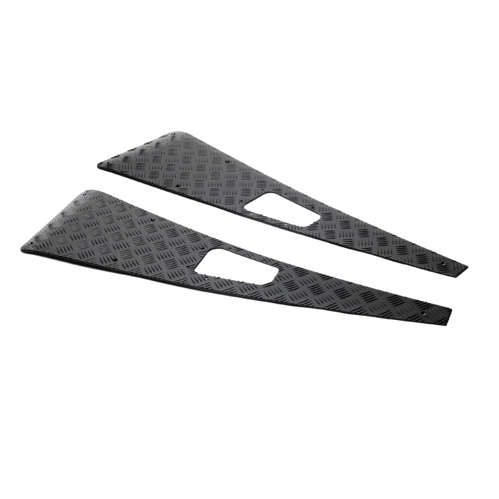 Aluminum 5-bar chequer plate wing top protection kit for Defender. 3mm thick for superior protection, finished in non-fade powder coated black. NO antenna hole in either side. This kit includes wing top protectors without an aerial hole, closed cell foam gaskets to prevent dirt ingress, and stainless steel hardware.