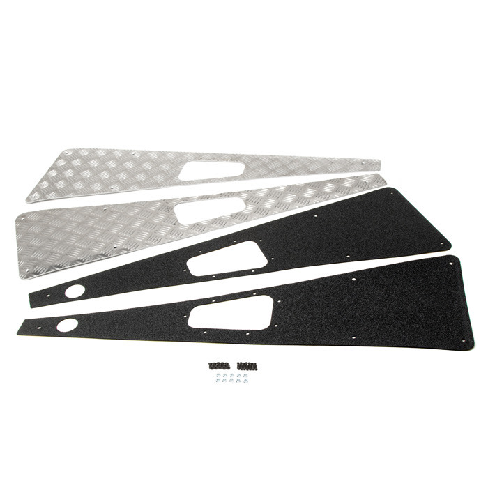 Aluminum, 5-bar chequer plate, wing top protection kit for Defender. 3mm thick for superior protection, clear lacquer coated for a gloss silver finish. This kit includes wing top protectors without an aerial hole, closed cell foam gaskets to prevent dirt ingress, and stainless steel hardware.