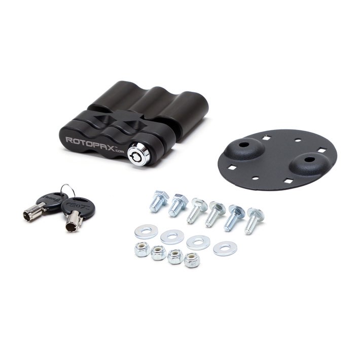 Locking mount for Roto Pax one gallon and two gallon fuel and water containers. Easy to use handle design gives more turning power to keep containers tight against mounting surface. Includes an insertable lock cylinder when security is required. Suitable for a single container.
