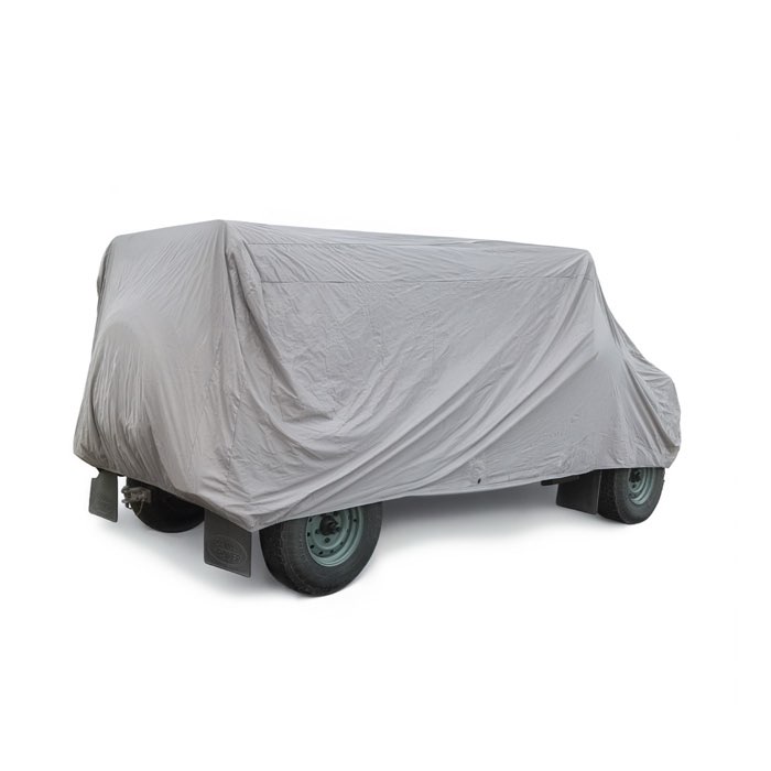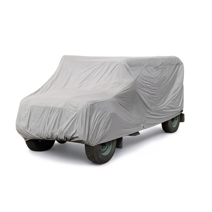 Outdoor car cover suitable for Series 109, Defender 110, Discovery I & II, LR2, LR3, LR4, Range Rover, Range Rover Sport, and Defender 110 L663. Manufactured from a strong and stretchy fabric that is breathable and waterproof. Occasional seepage may occur at the seams, but this moisture will naturally evaporate through the breathable fabric. If used for outdoor winter storage, condensation may form on the cold surface of the vehicle. Although this moisture will evaporate through the breathable fabric, it may be helpful to remove the cover occasionally to allow the vehicle and cover to air out. Secures underneath the vehicle with three sets of fully detachable straps. Includes carrying bag. Made in the UK.