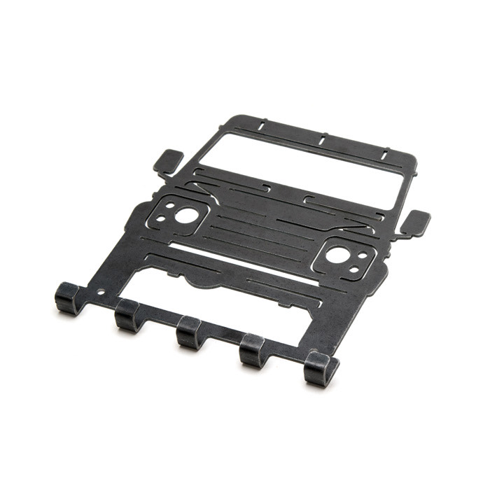 Defender inspired metal key rack. 14 gauge raw steel unfinished with two 3/16" holes for mounting - screws included. Rack features five hooks for keyrings. Great for the house or the shop. Measures 8" tall by 7.5" wide.