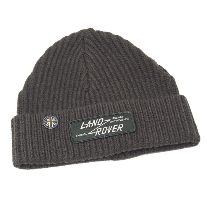 This thick wool blend beanie will keep you warm all winter. Featuring Land Rover and Union Jack patches.