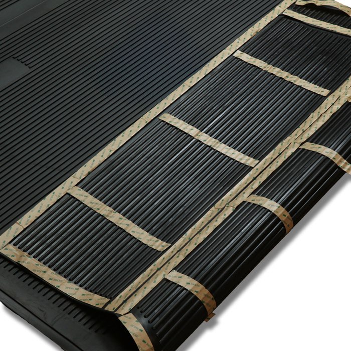 5mm ribbed rubber loadspace mat for Defender 90 with side fuel tank. Covers floor area and wheel arches. Can be modified to fit Defender 90 with rear fuel tank, requires cutting notch for fuel tank filler.