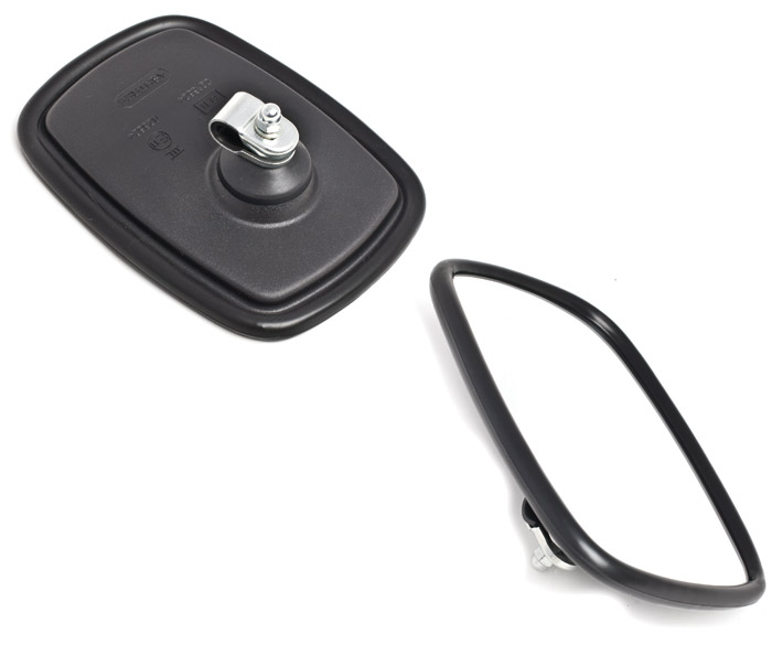 Rectangular mirror heads feature rugged black plastic bodies with rubber edge. Mirror clamp is lined with a rubber strip to ensure a secure fit to the mirror arm.