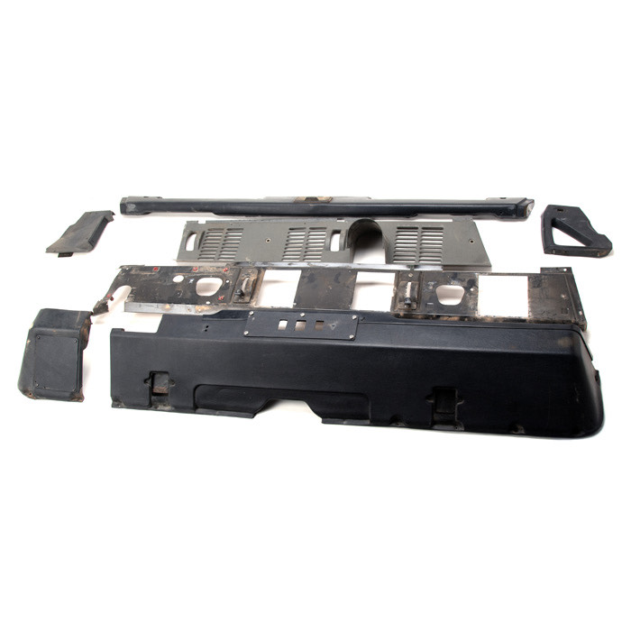 Used genuine dash kit for left hand drive Defender. This kit includes lower dash assembly without speaker hole, lower dash trim finisher, wiper motor cover, dash vent panel, dash vent facia panel, dash top with ashtray insert, grab handle, and dash top end cap facia. Okay condition.