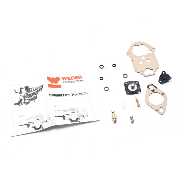 Weber brand service kit for Weber 34ICH carburetor. This kit contains gaskets, washers, seals, needle valve, accelerator pump diaphragm, and economizer diaphragm.